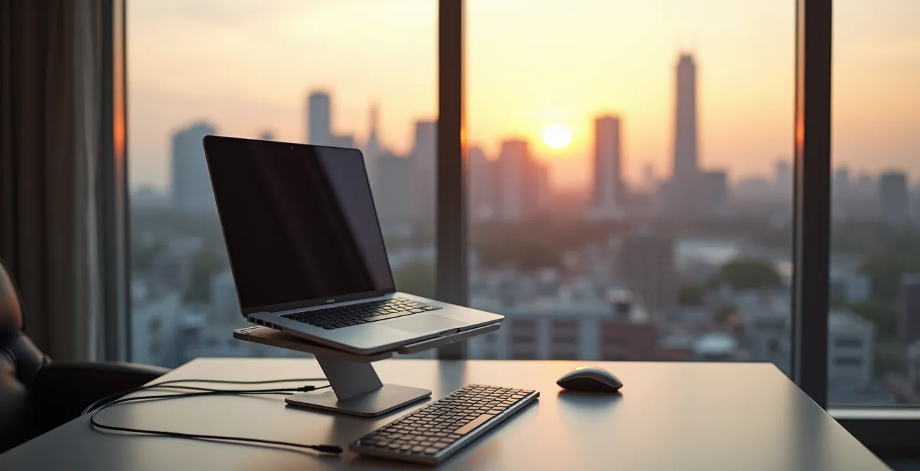 Your physical environment is the foundation of your productivity. Relying on a hotel’s random desk and chair is a gamble you can’t afford to take. Hunching over a laptop on a bed or a low table for eight hours a day isn’t just uncomfortable; it’s a direct assault on your focus and long-term health. The goal is location agnosticism for your body. You need a system to replicate a healthy, supportive work setup in any room, in under 10 minutes. This isn’t about luxury; it’s about professional sustainability.